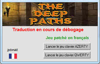 | The Deep Paths Ce jeu ne possède pas de réallocation des touches de déplacements et s'avère injouable avec le clavier français. The Deep Paths (avec clavier AZERTY) Copiez le fichier dans le dossier du jeu et le lancer pour démarrer le jeu. Ce programme comporte quelques problèmes de compatibilité suivant la version. Lors de ma traduction, les sauvegardes utilisaient la base de registre de Windows.